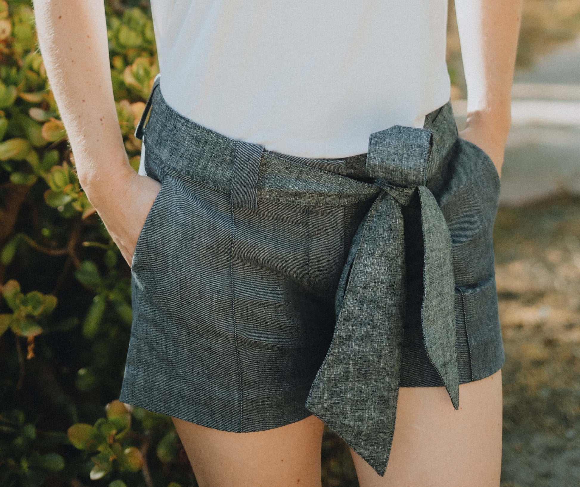 Effortless style to take you through the warm days of late summer and early fall. Our belted shorts are made from an organic cotton stretch twill and finished with a crisp chambray tie belt.