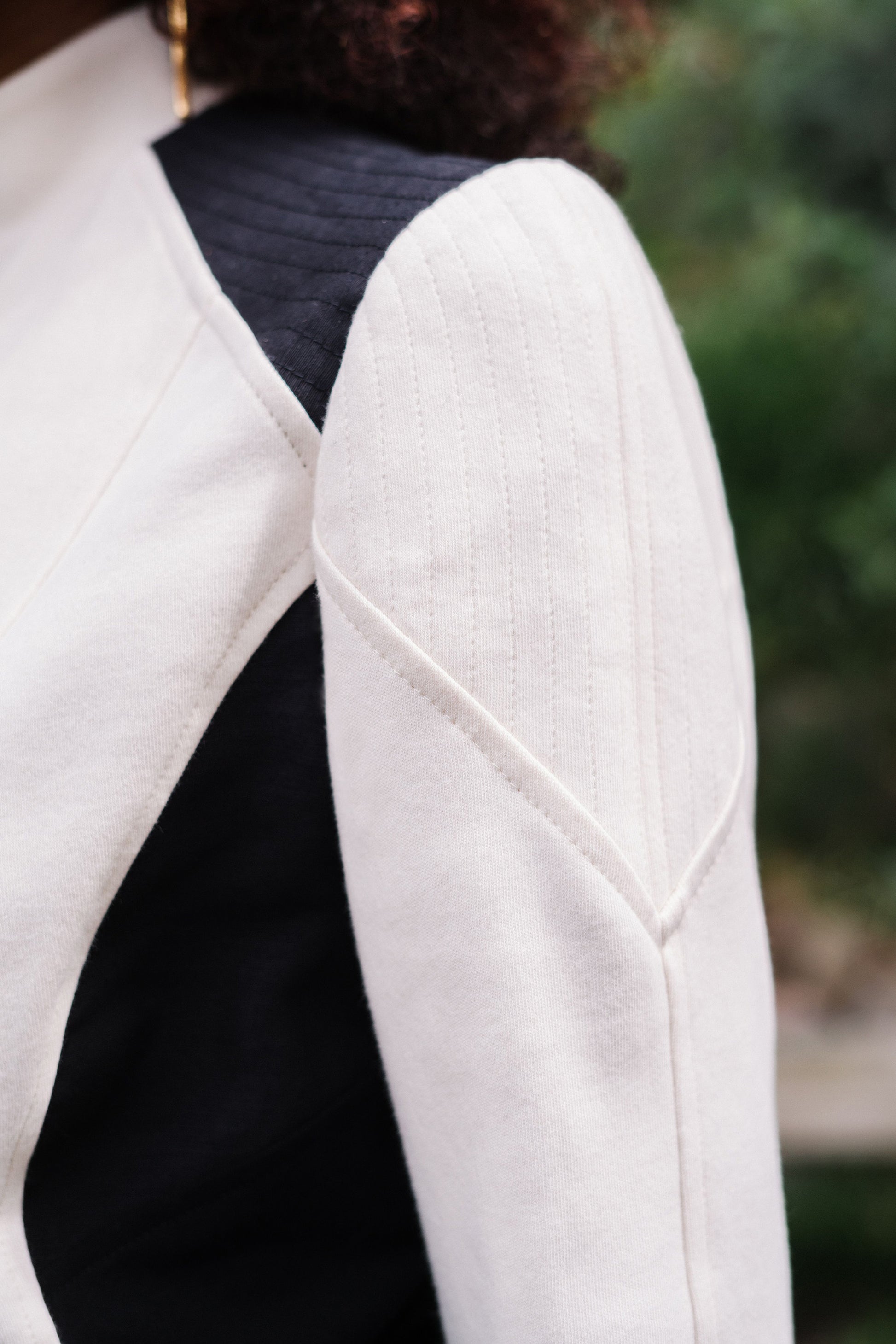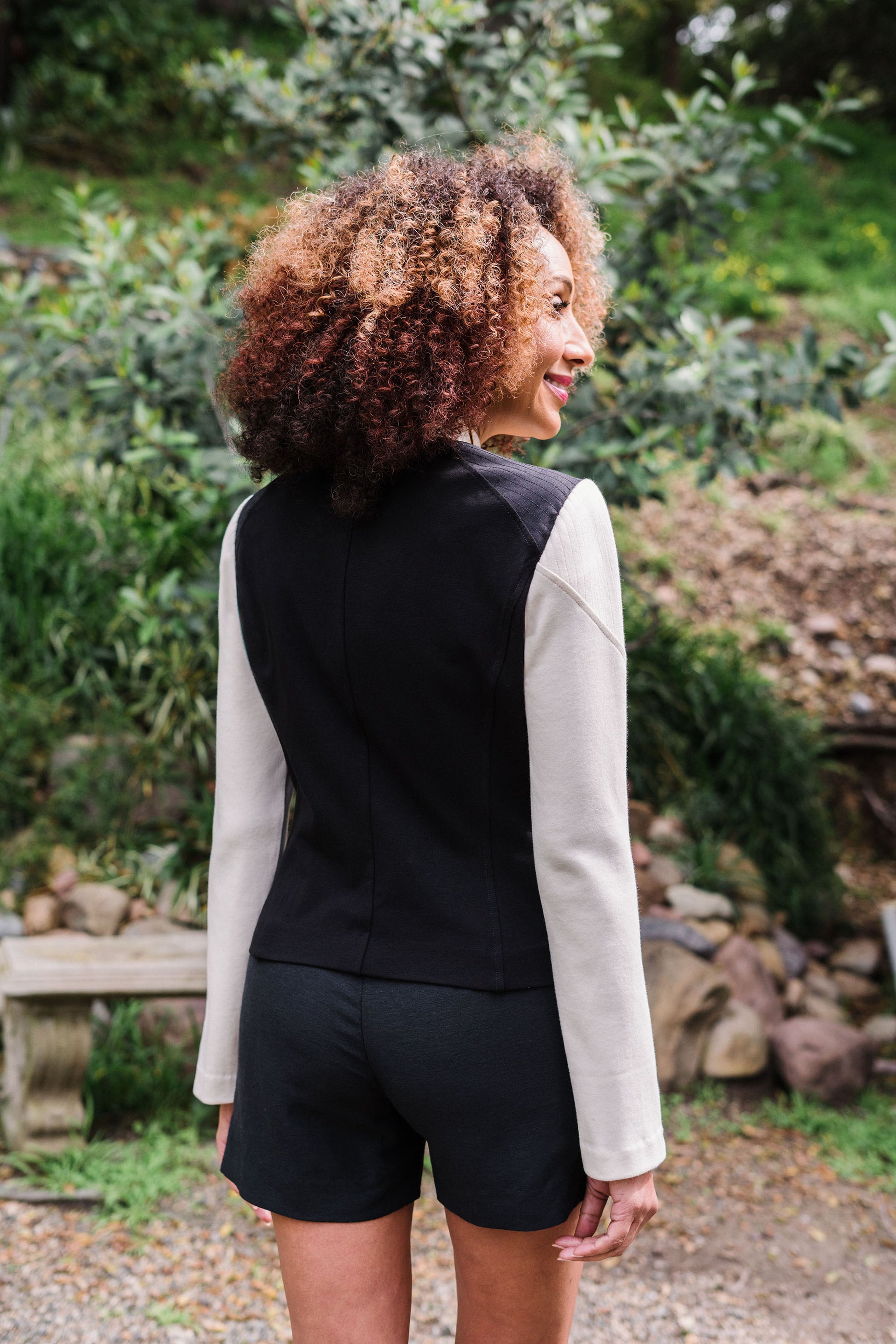 Polished chic inspired by a galaxy far, far away.  Channel the sleek looks worn by our favorite galactic heroines in this zip-front jacket.  Featuring panels of organic cotton interlock and slimming black Ponte; accented with Hemp/Silk contrast shoulder panels collected from our cutting floor.  Finished with a brass zipper on organic cotton tape.  Your new-and-forever stealth leisure favorite.