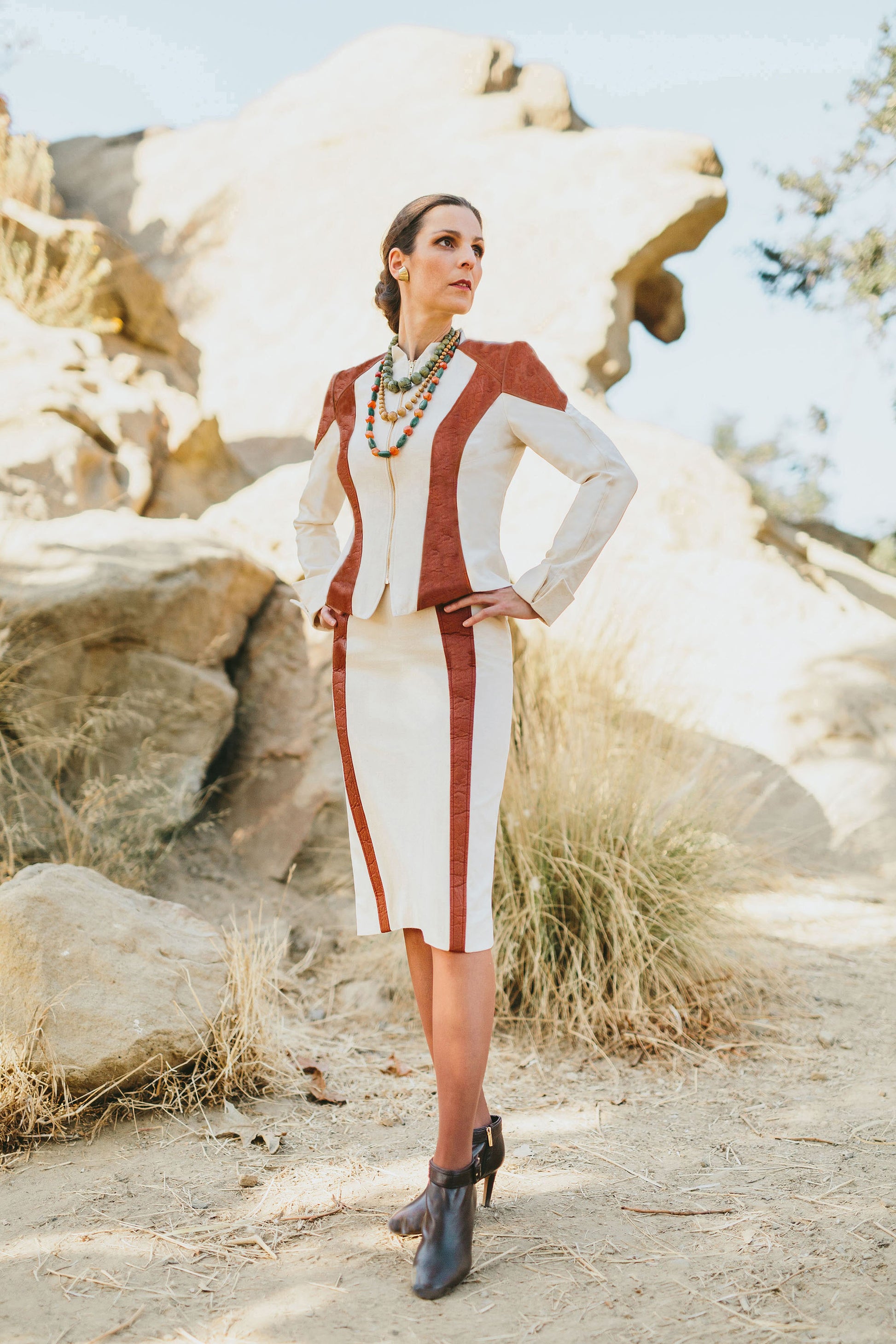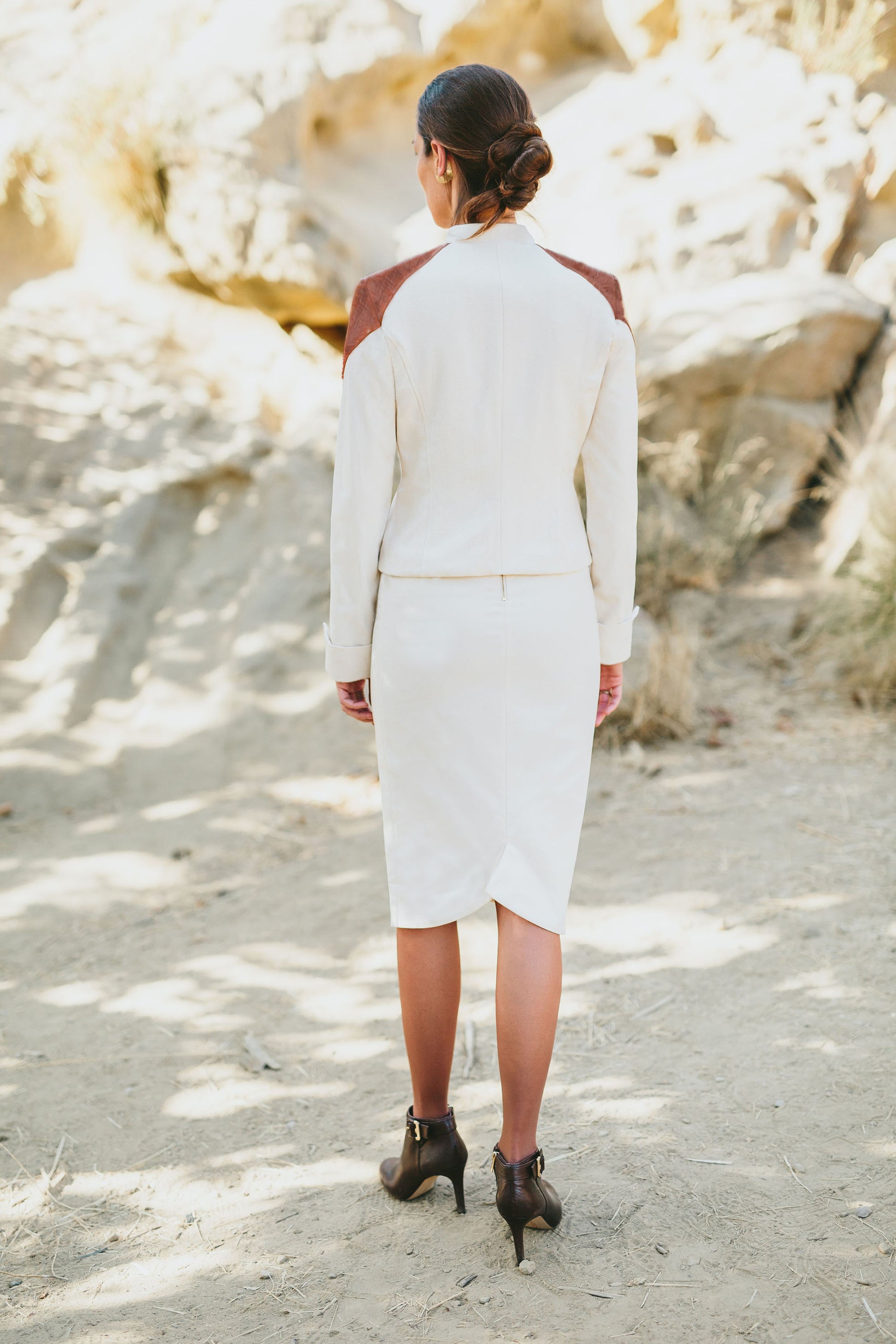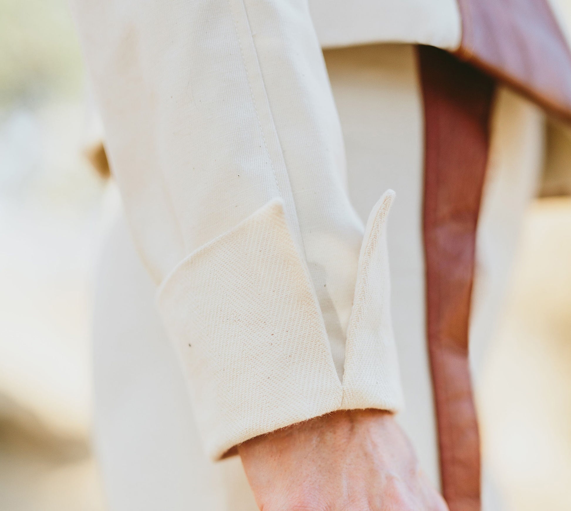 Inspired by General Leia Organa's in-the-field style, the sleek lines of this zip-front jacket are highlighted with panels of deadstock Organic Cotton Herringbone, Twill and Pinatex---a revolutionary plant-based leather alternative. Featuring turn-back cuffs; lined in soft cotton voile and trimmed with a 100% Silk "Galaxy" print salvaged from the cutting room floor.