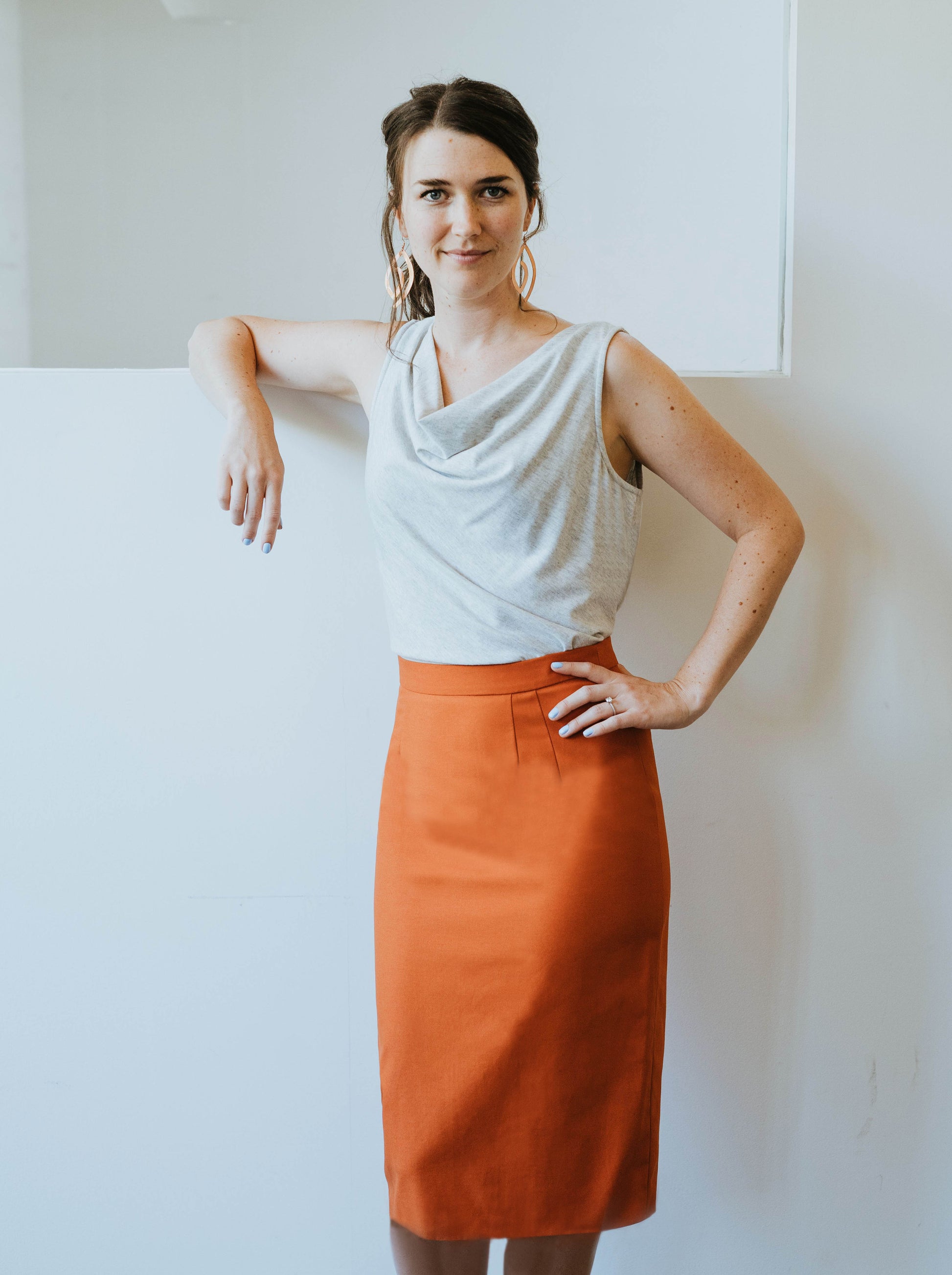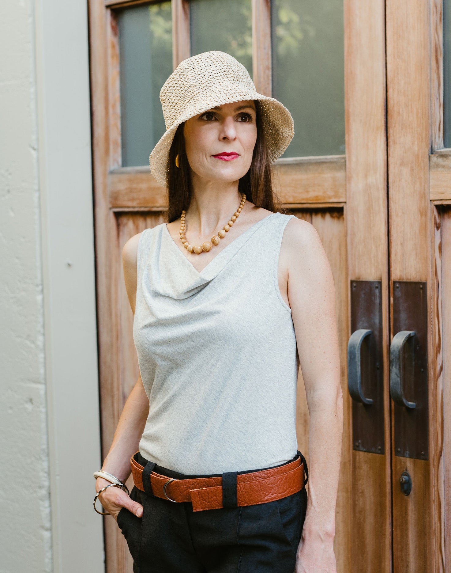 Heathered Jersey blend of Organic Cotton, Bamboo Viscose & Recycled Polyester. The feel of a favorite t-shirt, finished with a flattering cowl-neck drape.