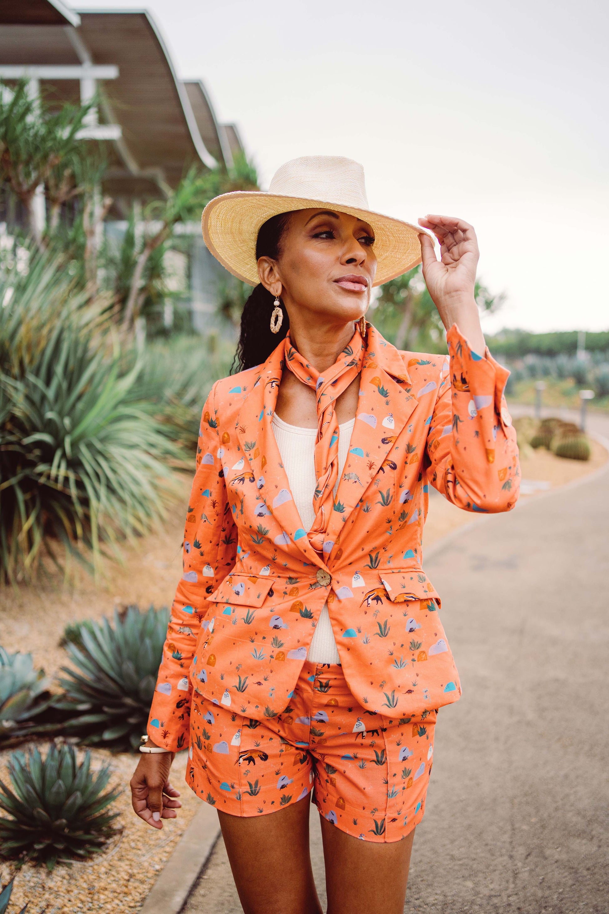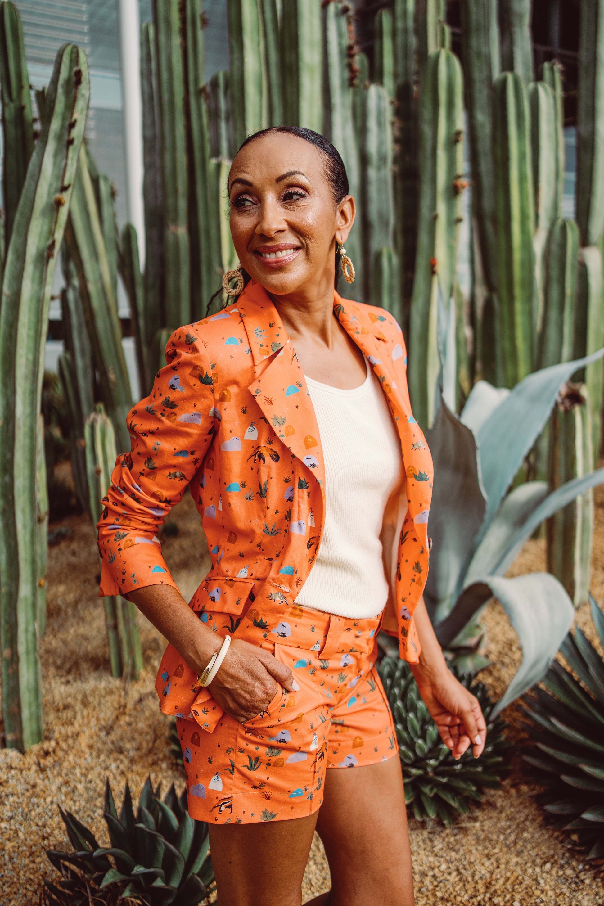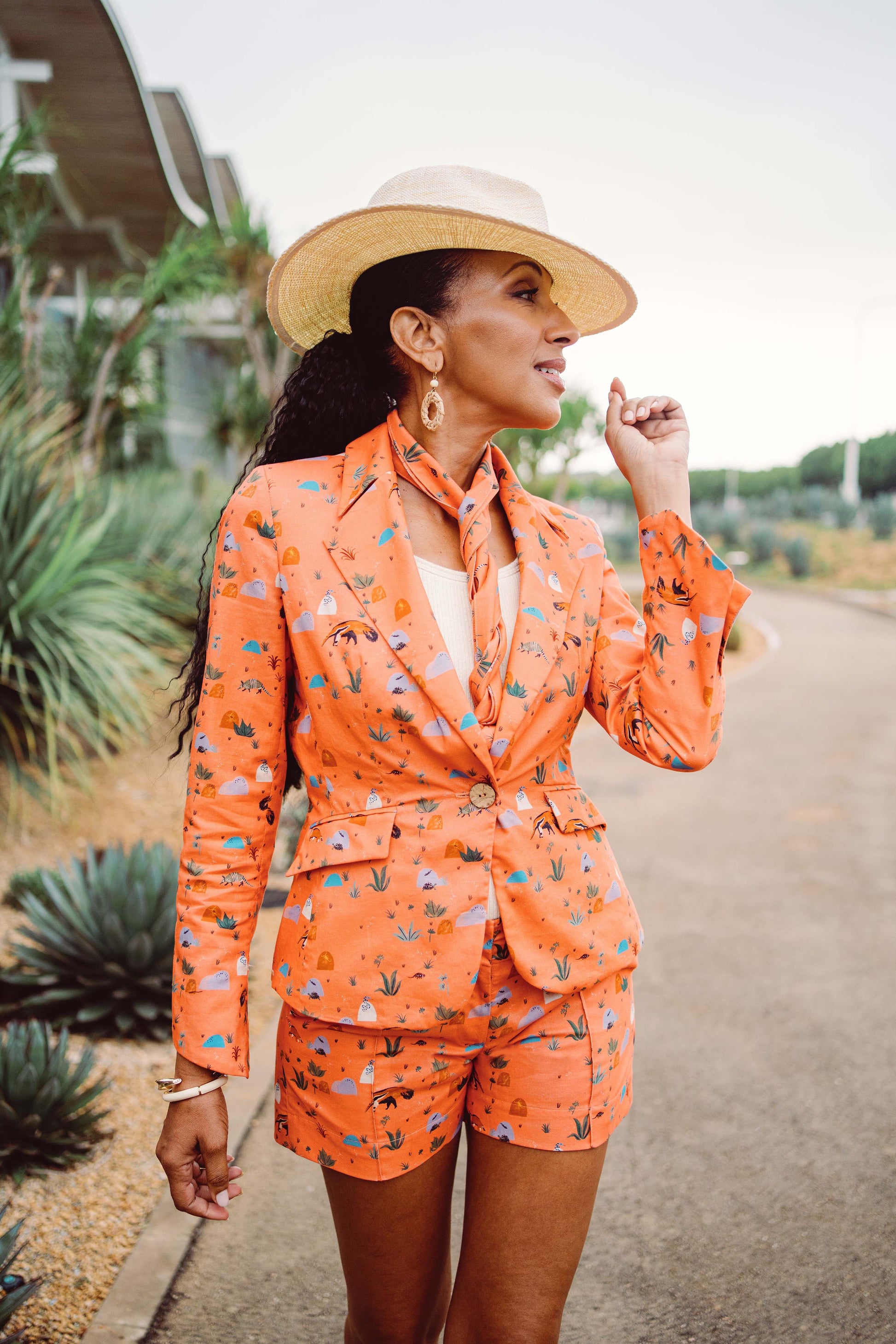 Introducing the "Resilient Creatures" print jacket. Featuring the flora and fauna of the Desert Southwest, its warm Persimmon hue is the perfect transition from high summer to early autumn.