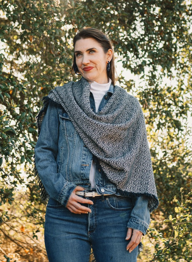 Winter in the West calls for warm layers like this luxurious tweed wrap. Hemp/Wool Tweed blend, cut to a generous length and finished with hand-fringed yarn accent.